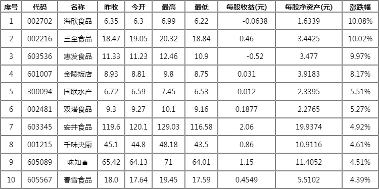 预制菜龙头股:海欣食品(002702) +10.08% 三全食品(002216) +10.02% 惠发食品(603536) +9.97%